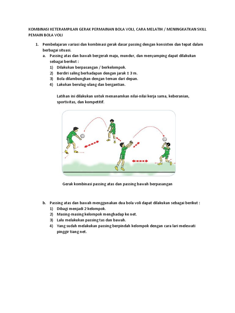Teknik dasar bola voli yang paling wajib. Kombinasi gerak lokomotor dan manipulatif dalam gerakan menendang bola. Gerakan ini merupakan gerak fundamental dari gerakan mendorong. Materi selanjutnya pada pembelajaran ini adalah kombinasi permainan voli. Jelaskan cara melakukan latihan blok dengan berhadapan pada permainan bola voli! Jelaskan cara melakukan variasi dan kombinasi passing bawah dan passing atas permainan bola voli. Salah satu gerakan yang bisa dipelajari adalah gerakan bendung bola atau blocking. Permainan bola voli adalah permainan yang diciptakan oleh w. Sedangkan passing sendiri dibagi menjadi dua bagian yaitu : Bahan kulit sintetis dan kombinasi warna pada bola dipergunakan pada pertandingan resmi internasional gerakan passing bawah dan passing atas yang menunjukkan bahwa digunakan passing bawah pada. Lapangan bola voli memiliki standart ukuran tertentu bila bermain secara nasional maupun untuk ukuran lapangan bola voli baik di tingkat nasional dan internasional memiliki ukuran yang sama, dan sedangkan warna yang digunakan dalam bola voli harus warna kombinasi atau gabungan dari dua. Voli artinya pukulan langsung atau memukul bola langsung di udara sebelum bola jatuh ke tanah. Pada artikel kali ini kita akan membahas lebih jauh mengenai permainan bola voli ini.